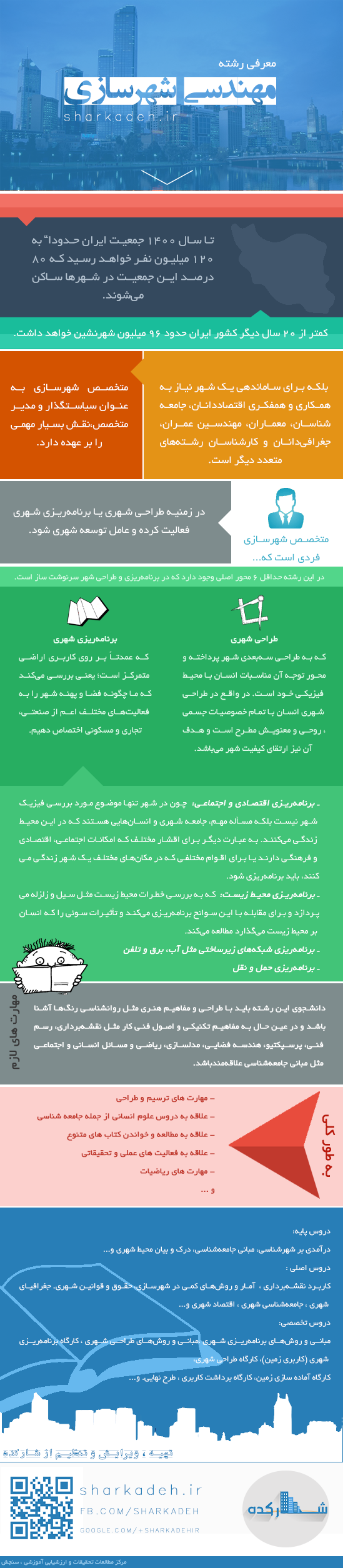 دانش آموزان پس از کنکور و در مرحله ی انتخاب رشته معمولا" با سوالات زیادی درمورد رشته های تحصیلی مواجه میشوند. تا اعلام نتایج کنکور امسال و انتخاب رشته دانشگاهی نیز چیزی باقی نمانده است. شارکده از این پس تصمیم به تهیه و انتشار برخی داده نمایی ها یا اینفوگرافیک دارد. اینفوگرافیک ها نمایشگرانی هستند که داده ها و اطلاعات را به زبان تصویری ساده ، برای مخاطب بیان می کنند. استفاده از گرافیکهای اطلاع رسان باعث میشود بیننده، حجم قابل توجهی از اطلاعات را که شکل نوشتاری آن ممکن است مقاله بلند بالایی را تشکیل دهد، به سادگی و در کوتاهترین زمان ممکن از طریق بصری دریافت کند. از این پس با نگاهی کوتاه و ظاهری زیبا و جذاب برای دیدگان مخاطب ما به معرفی مفاهیم شهرسازی خواهیم پرداخت. در اولین اینفوگرافیک شهرسازی که اختصاصا" توسط شارکده تهیه و ویرایش شده است به معرفی رشته شهرسازی خواهیم پرداخت. تا افراد از این پس با آگاهی بیشتری این رشته را انتخاب نمایند...